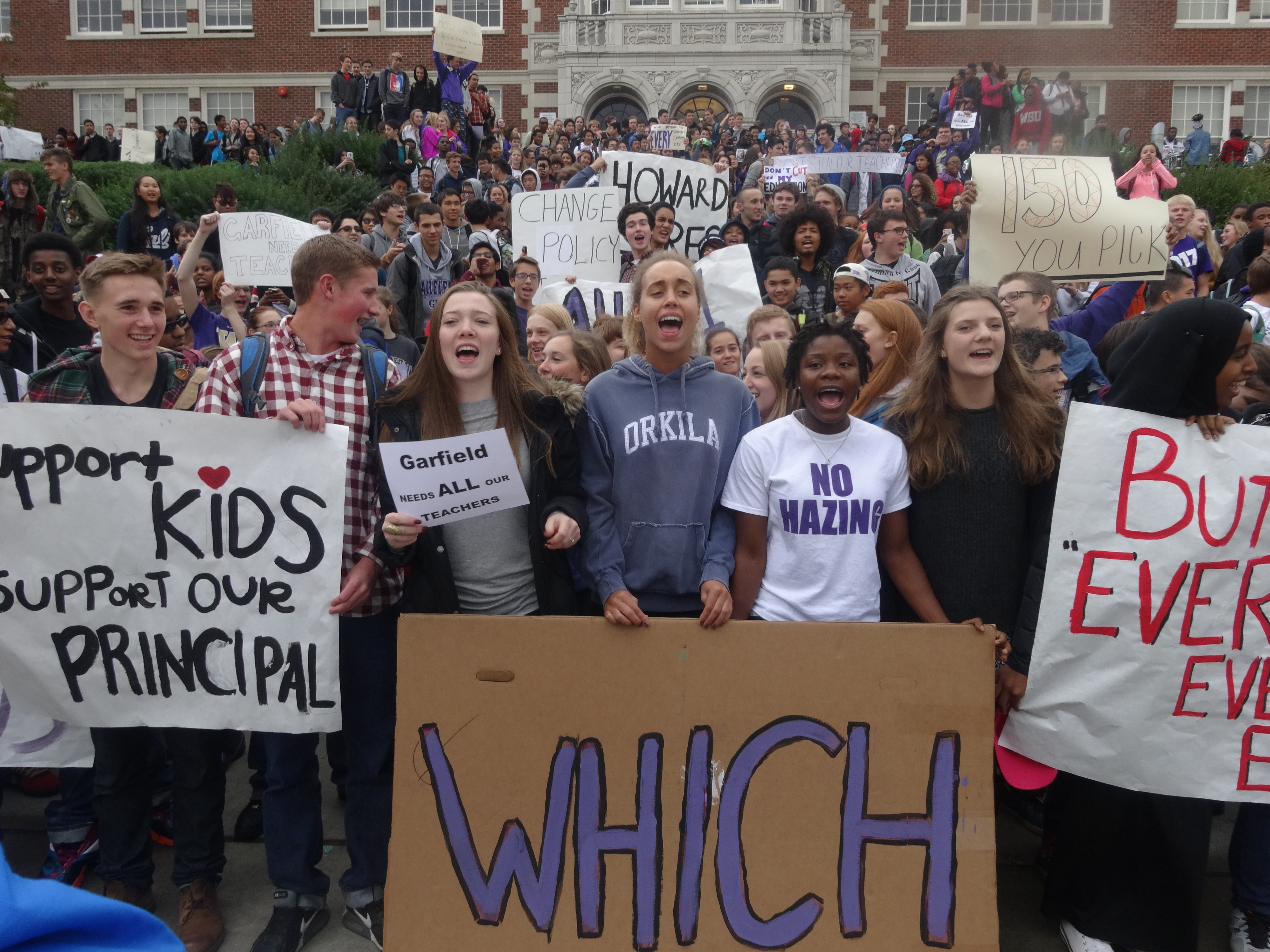 GHSWalkout_1At 1:50pm last Thursday, members of the award-winning Garfield High School drum-line announced the walkout with their signature hypnotic snare drum polyrhythms and led a mass exodus out of the building. Almost the entire school emptied and hundreds assembled on the front steps, students calling, “Let us graduate,” with teachers responding, “Let us educate.” Student body President Harald Hyllseth grabbed a bullhorn and declared, “If the motto of the Seattle Public Schools is truly, ‘Every Student, Every Classroom, Everyday,’ they won’t take a teacher away from us!” Garfield History teacher Hersch Mandelman addressed the crowd saying, “You students do not yet have the right to vote…but you do have the right to a voice!” School Board Director Sue Peters, also a Garfield High School parent, also addressed the crowd, saying she had talked with Superintendent Nyland and encouraged him to review the numbers and to pay to keep the teacher with money from the district’s rainy day fund–which totals millions of dollars. As well, a solidarity statement was read, sent from many faculty at Seattle’s Rainier Beach, which stated in part: