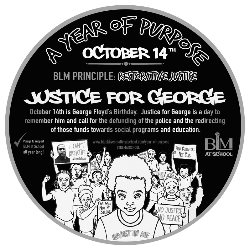 Wednesday, Oct. 14th is George Floyd's birthday. Join Black Lives Matter at School, the WA State NAACP Youth Council, and National Educators United on October 14th at 5 pm PDT/8 pm EDT for a town hall to celebrate George Floyd’s birthday. We'll have educators, students, and activists speaking from Minneapolis, Louisville, Seattle and around the country. In addition, Black Lives Matter at School is calling on educators and families to facilitate a eight minuet and 46 second timed activity with youth asking them to write or draw about the future they want to live in.