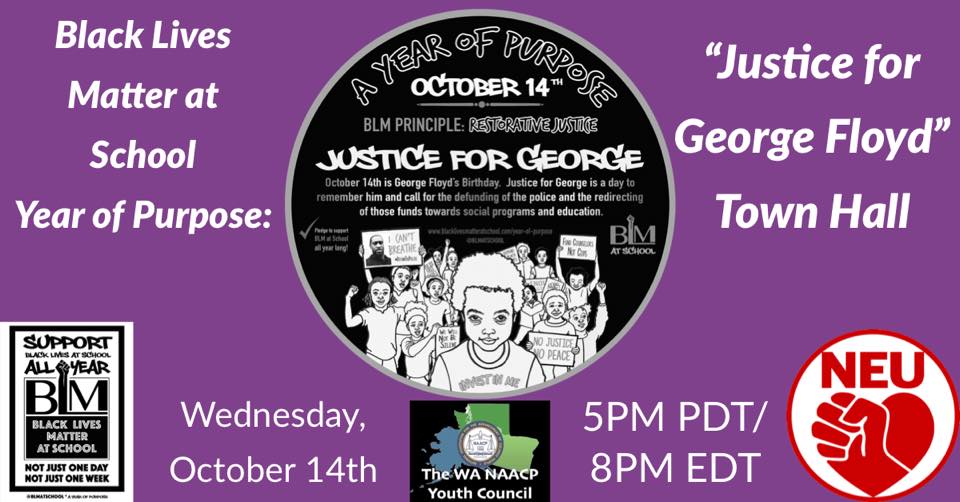 Join Black Lives Matter at School, the WA State NAACP Youth Council, and National Educators United on October 14th at 5 pm PDT/8 pm EDT for a town hall to celebrate George Floyd’s birthday. We’ll have educators, students, and activists speaking from Minneapolis, Louisville, Seattle and around the country.