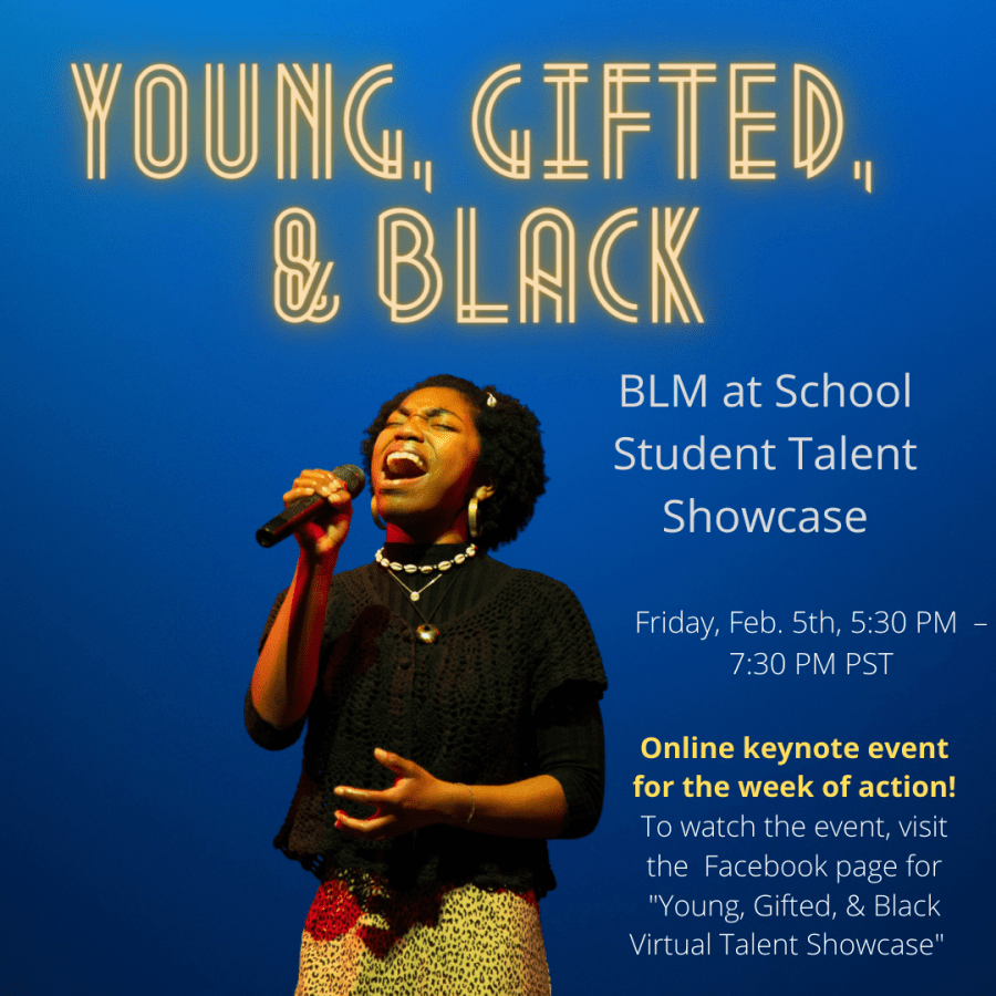 Youth dancers, poets, filmmakers, rappers, singers, and speakers will take to the stage for this year's "Young, Gifted, & Black Student Talent Showcase," one of the keynote events of the 2021 Black Lives Matter at School week of action, February 1-5. This event will be held on-line from 5:30pm--7:30pm Pacific. To watch the event, visit the Facebook page for "Young, Gifted, & Black Virtual Talent Showcase"