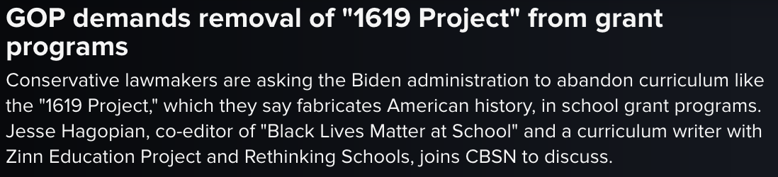 I joined CBS News anchor Tanya Rivero on her program to discuss the request from Republican lawmakers to rescind any support of the 1619 Project and to talk about the proliferation of bills in state legislatures around the country that would ban teaching about structural racism. In the interview I called on educators to sign the new petition from the Zinn Education Project that calls on teachers to pledge that they will teach about the long legacy of structural racism, sexism, heterosexism, and other forms of oppression–regardless of the law.