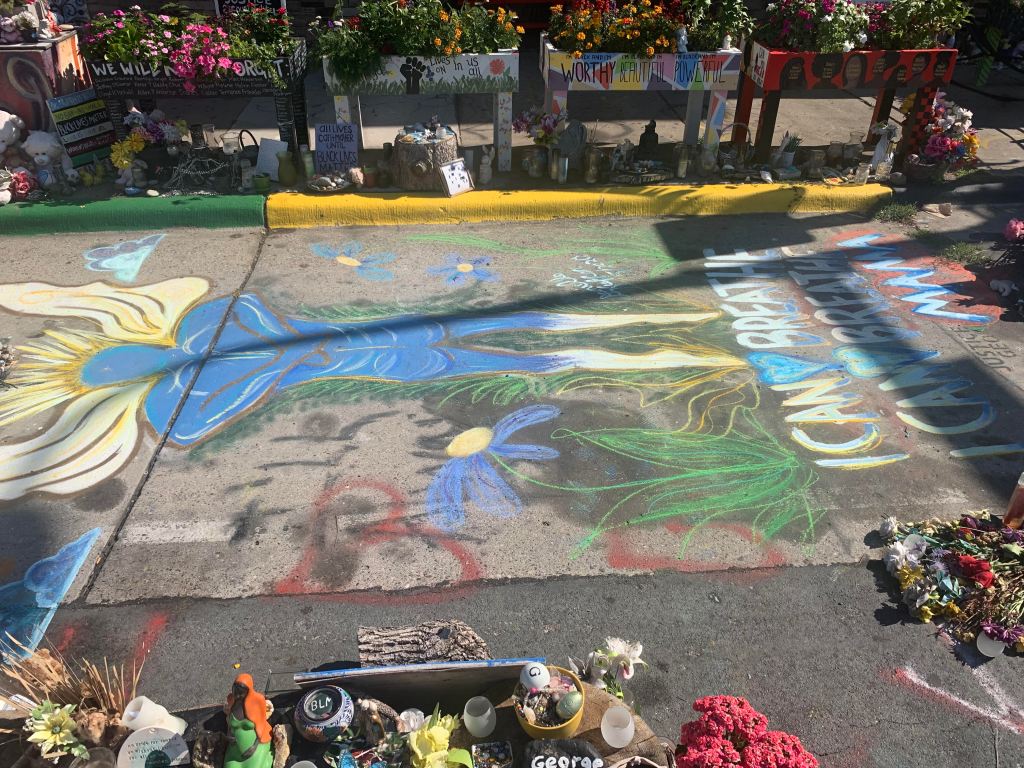When the children passed, I sat on one of the benches that activists had erected at the memorial and worked on summoning the courage to approach the spot where George died. After some time, I made my way to the flowerboxes that encircled the very spot where George’s face had been pressed into the concrete. Painted where George’s body had lay, was a striking image of blue spirit emerging from radiant yellow and white light and the words, “I Can❤️Breath, I Can❤️Breath.”
