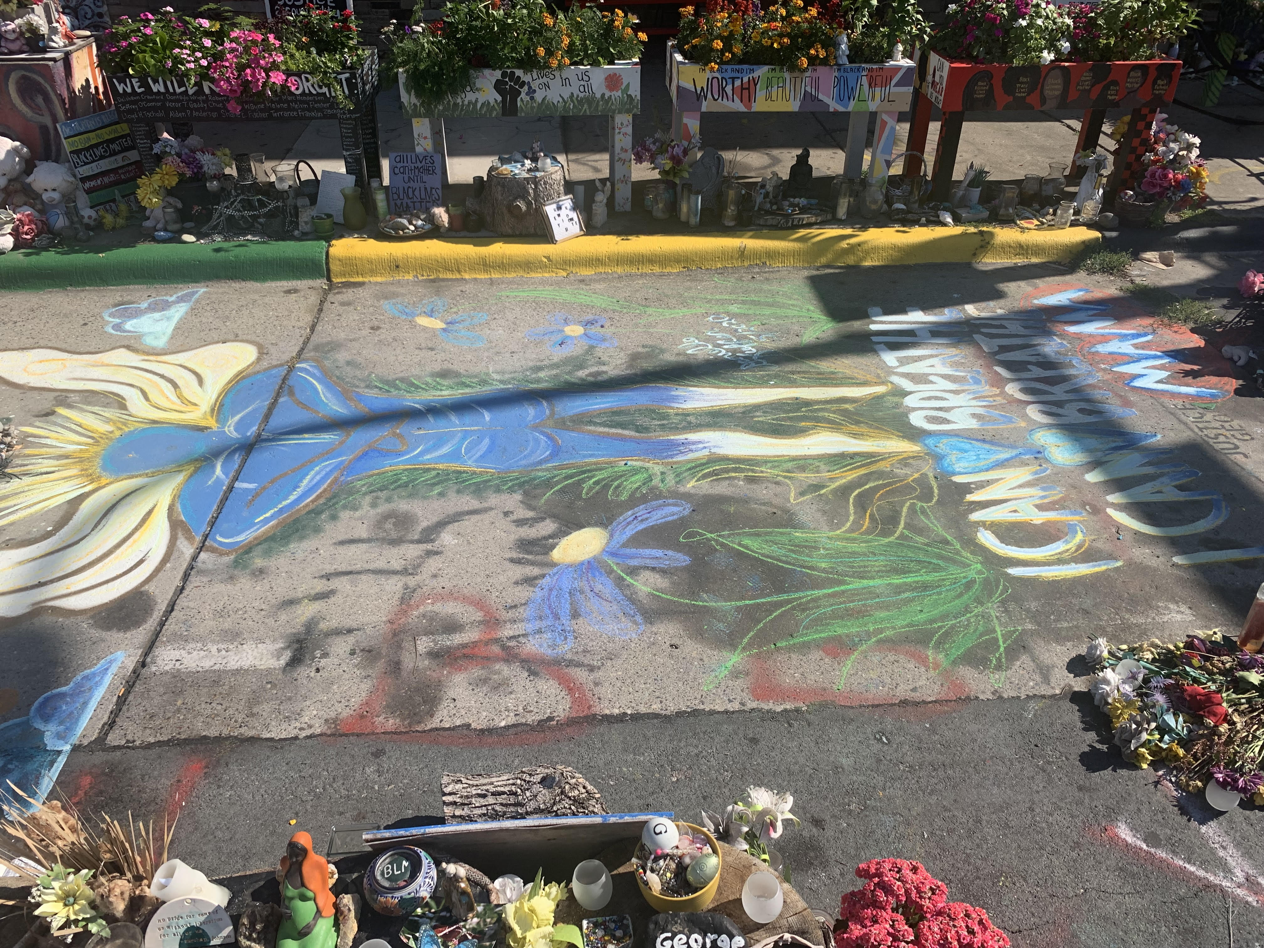 When the children passed, I sat on one of the benches that activists had erected at the memorial and worked on summoning the courage to approach the spot where George died. After some time, I made my way to the flowerboxes that encircled the very spot where George’s face had been pressed into the concrete. Painted where George’s body had lay, was a striking image of blue spirit emerging from radiant yellow and white light and the words, “I Can❤️Breath, I Can❤️Breath.”
