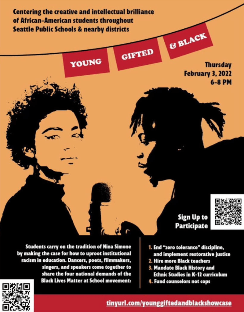 To help celebrate the 5th annual Black Lives Matter at School Week of Action, youth in Seattle have taken up organizing a “Young, Gifted, & Black Student Talent Showcase“–held online, Thursday, February, 3, 2022 from 6-8pm PT.