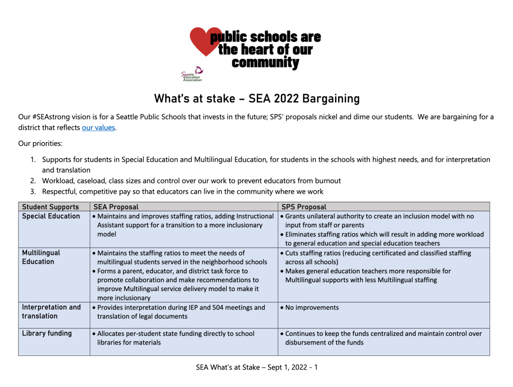 The Seattle Education Association put together the below document to outline the major points of contention that remain between the union and the school district. The issues that Seattle educators are striking over are very clear and everyone who believes in labor solidarity and supporting more vulnerable student populations should sign the petition in support of the strike. As well, you can email the Seattle School District with this form to let them know they should agree to the unions demands.