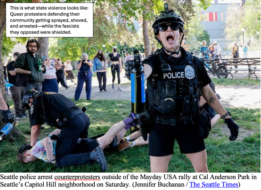 That fascists would want to insert their hateful, transphobic, and homophobic message directly into the LGBTQIA+ community is predictable. But the absolutely shameful fact is that Seattle Parks officials recommended that this anti-LGBTQ+ group hold their rally at Cal Anderson Park—they hadn’t even originally planned to hold it there... There is a war being waged on LGBTQIA+ people—by the state and by the raising forces of fascism it is enabling.